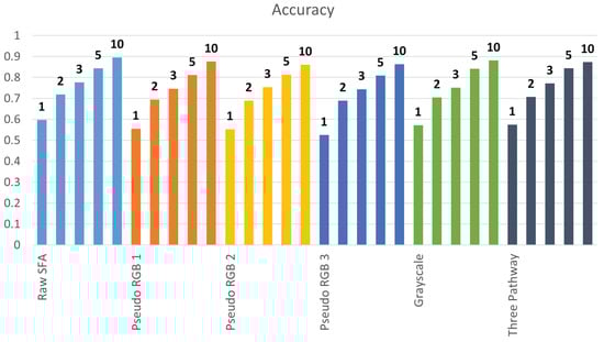 Configuration 6, which is the proposed model, surpassed Configuration 1 with raw SFA at K = 1, 3, and 5. It was the best performing model at these values of K. The model utilizes the raw SFA image by constructing three pseudo-RGB images and performing inference independently. The results of the three forward passes were combined, and the prediction was chosen. This introduced robustness and reduced noise in the predictions, leading to better results.