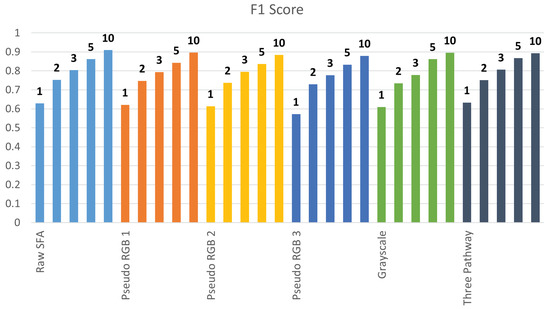 Two main reasons for the disparity in performance of both tasks is that the indoor vs. outdoor classification decision is taken with a majority vote of the top 10 scores, while for scene recognition only the top 1 score is considered. Configuration 6 performs better on the more difficult scene recognition task, demonstrating a better bias–variance trade-off based on the F1 score. This is because it combines the decision of three networks. Another reason is that the model is not trained on our dataset, and thus the input is out of distribution for it. Configuration 4 has the worst performance due to the panchromatic channel set to the blue channel, resulting in the most color-incorrect image compared to the other pseudo-RGB images.