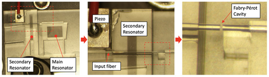 Fabry–Pérot interferometers are very well suited to measure the displacement of the mechanical resonator’s test mass with high precision [18,19,20,21,22,23,24,25]. In our case, we used two optical fibers cleaved to a near-zero-degree angle. The cleaved edges of the fibers act as flat mirrors with low reflectivity (∼4%), forming a low-finesse optical cavity. One of the fibers is adhered to the test mass of the main resonator with UV curing adhesive. The other spans across and is adhered to the test mass of the secondary resonator in the opposing direction, as shown in the pictures in Figure 1 and the schematic in Figure 2. Light is brought to the cavity using an optical circulator. The laser light is coupled with port 1 and transmitted to port 2, which is connected to the input fiber of the cavity. The light reflected from the cavity is coupled back with the circulator and transmitted to port 3, where a photodetector measures the signal generated from the cavity. A 1550 nm wide tunable Newport laser was used as the light source. Wide-band tunability is necessary to operate with m long optical cavities.
