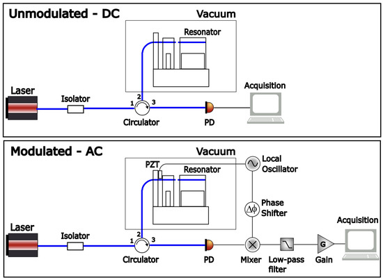 Compact opto-mechanical resonators provide highly precise displacement measurements. The sensitivities of such systems depend on the mechanical resonator itself and the optical readout method. The latter measures the resonator’s motion, which is converted to acceleration using the resonator’s transfer function. An attractive displacement measurement method due to its excellent performance and simplicity is the use of fiber-based optical cavities [18,19,20,21,22,23,24,25]. In the configuration used here, the fiber ends are used as mirrors to create a low-finesse micro-cavity between the resonator’s test mass and frame. The motion of the test mass generates a signal that can be measured by a photo-detector (PD), which is first converted to displacement and then to acceleration. In its basic form, a DC measurement of the PD voltage is sufficient. However, this measurement is susceptible to low-frequency noise sources of different natures, e.g., 1/f electronics noise, PD dark current noise, or laser intensity fluctuations. The contribution of these noise sources can be minimized by using AC measurement techniques, as explored in this manuscript.