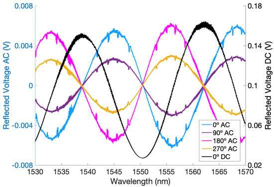 Wavelength scans of the Fabry–Pérot cavity. In-air low-pass-filtered wavelength scans of the demodulated AC signal with various phase shifts (blue voltage scale on the left) plotted alongside the DC signal, which is not yet demodulated (black trace with black voltage scale on the right) for the comparison of slopes and working point locations. The cavity can be characterized using the black DC trace, which appears the same as the unmodulated DC wavelength scans and where , m, THz, and . Working point locations are at the half-maximum, where the curve is approximately linear. It is clear that the working point location shifts about 5 nm between the DC and AC cases. In AC, the maximum slopes occurs at 0° and 180° phase shifts.