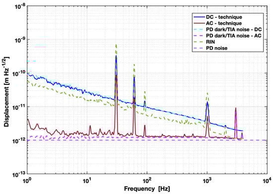 The motion displacement results are shown in Figure 4 in terms of the ASD, i.e., in units of m/. The frequency range spans from 1 Hz to 5 kHz, the range where the AC technique showed a significant effect. The displacement sensitivity was 90 pm/ at 1 Hz for the DC technique and 4 pm/ (white noise) at 1 Hz for the AC technique. It is clear that the AC modulation technique effectively suppressed the 1/f noise present in the DC case and, thus, provided significant improvement compared to the unmodulated results.