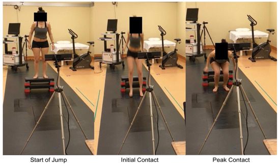 Images of the Kinect V2 setup with freeze frames from the beginning of the DVJ as well as the two significant time points: initial and peak contact. The Kinect V2 was mounted on a tripod at a distance of 2.5 m from the participant for optimal accuracy.