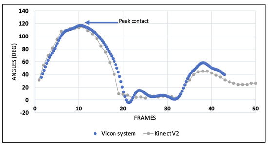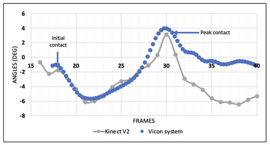 Graphical representations of the frame-by-frame angles measured for a single DVJ by both the Kinect V2 and the Vicon system are presented in Figure 3 and Figure 4 for the coronal and sagittal angles, respectively. In the coronal plane, there is a moderate degree of angle variation between frames and between the two systems; however, the concordance at the frames of interest (initial contact and peak contact) is high. Figure 4 reveals a high degree of concordance between the two systems for tracking sagittal angles throughout all frames of the DVJ.