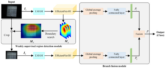 The framework of the high-frequency workpiece recognition model proposed in this paper that integrates global attention and local attention is shown in Figure 1. It mainly consists of three modules: lightweight mixed attention module (LMAM), weakly supervised region detection module, and branch fusion module. First, the whole workpiece image I1 is input into the lightweight mixed attention module (LMAM) to obtain enhanced features, and then, the multi-layer feature map Mg and recognition results P1 are generated through the lightweight network EfficientNet-B1. Second, in the weakly supervised area detection module, the local workpiece image I2 is intercepted based on the whole workpiece image I1 and multi-layer feature map Mg, and it is imported into the LMAM and EfficientNet-B1 of another branch to obtain the recognition result P2. Finally, the branch fusion module is used to fuse the results of the two branches to obtain the final recognition result P.