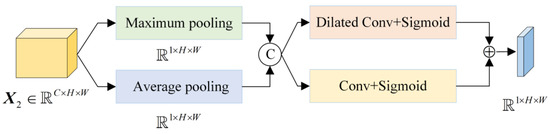 Perform maximum pooling and average pooling on each pixel of the input feature map by channel, then perform channel concatenation on the two obtained feature maps. Next, perform convolution with a kernel size of 3 × 3 and a dilated convolution with a kernel size of 3 × 3, where the dilation rate is set to 1 and 2, respectively. In order to ensure that the size of the feature map remains unchanged, the padding parameters need to be set, and, finally, the spatial attention weight is obtained through activation and addition operations.