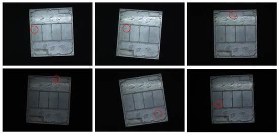 The high-frequency workpiece image dataset used in the experiment comes from a research institute in China. The dataset contains 20 different categories of workpieces. Each category of workpieces has 1000 images, totaling 20,000 images. The size of the image is 3822 × 2702. The dataset is randomly divided into a training set and a validation set in a ratio of 7:3. Figure 5 shows examples of six different categories of high-frequency workpieces, where the red circle indicates the small differences between the six categories. It can be seen from Figure 5 that for each type of high-frequency workpiece image, its internal texture is characterized by complex texture; for different types of high-frequency workpiece images, the differences between the classes are small. In addition, there are also local bright spots caused by uneven lighting in the image. Therefore, classifying multi-category high-frequency workpiece images is an equally challenging task.