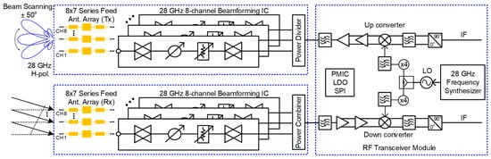 Block diagram of the proposed 28 GHz RF beamforming system and transceiver module.