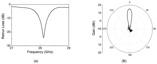 According to antenna array theory, a linear array can achieve a minimized sidelobe level (SLL) by tuning the amplitude and phase of individual elements. The 28 GHz RF beamforming system employs a 1 × 7 series-fed microstrip patch antenna capable of designing a phased-array antenna with low beam width using CMOS BFIC, although beamforming is only possible in the horizontal direction. Figure 2 shows the geometry of the 1 × 7 series-fed microstrip patch antenna linear array. In the case of a series-fed patch antenna array, the amplitude is associated with the patch width, while the phase is linked to the element spacing. Consequently, achieving a low SLL involves the tapering of the patch width and introducing unequal spacing between elements. The series-fed microstrip patch antenna boasts advantages such as its compact size and enhanced directivity, making it well-suited for beamforming applications. The size of the series-fed microstrip antenna is determined using the Chebyshev weighting method and manufactured using a low-loss RF PCB substrate. The seven patch elements with the same length w are arranged symmetrically, and they are connected by a narrow microstrip line. Figure 3a shows simulated return loss results of the 1 × 7 series-fed antenna. The return loss of the antenna obtained is over −10 dB at 28 GHz. Figure 3b shows the 2D E-plane radiation pattern of the antenna at 28 GHz center frequency. The antenna gain is 15 dBi and the 3 dB beam width is 15°.