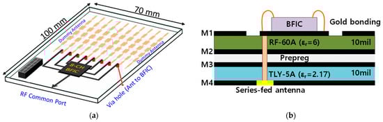 (a) Proposed RF beamforming antenna system. (b) Cross-section of RF PCB with the bonding.