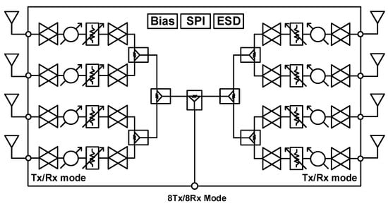 - Yeh, Y.S.; Floyd, B.A. Multibeam Phased-Arrays Using Dual-Vector Distributed Beamforming: Architecture Overview and 28 GHz Transceiver Prototypes. IEEE Trans. Circuits Syst. I Regul. Pap. 2020, 67, 5496–5509. [Google Scholar] [CrossRef]