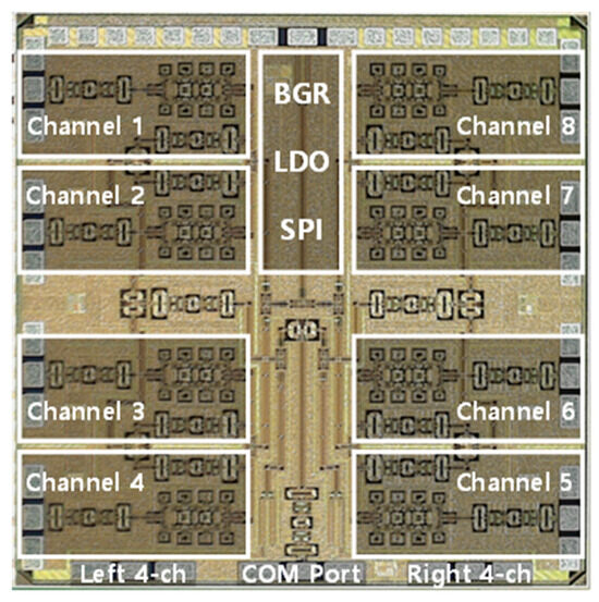 The proposed block of the 28 GHz RF beamforming system is shown in Figure 4a. The beamforming system uses an RF low-loss PCB, and the cross-section of RF PCB with chip bonding is shown in Figure 4b. An 8 × 7 phased-array antenna is manufactured using a 1 × 7 series-fed microstrip patch antenna. The spacing of each antenna is 5 mm at 28 GHz. The planar-type phased-array antenna connects the RF and series-fed patch array antenna using a hole for signal feeding. Equations (1) and (2) show that the antenna gain and the EIRP are directly proportional to the number of elements in the array. The 28 GHz RF beamforming system incorporates an eight-channel fully differential beamforming IC. This implies that eight antennas can be connected simultaneously for either 8Tx (transmit) or 8Rx (receive) mode separately, as all eight channels can operate bidirectionally, resulting in a narrow beam, high EIRP, and improved SNR. This configuration allows for the versatile operation and efficient utilization of antenna resources for transmission and reception. The simplified block diagram of the eight-channel TRX beamforming IC is shown in Figure 5. The 28 GHz eight-channel CMOS beamforming chip was mounted on a PCB using Chip-on-Board (COB) technology. The microphotograph of the 28 GHz eight-channel fully differential CMOS BFIC is shown in Figure 6. Each channel of an eight-channel fully differential CMOS T/R IC consists of six-bit differential phase shifters, three-bit differential attenuators, differential two-stage bi-directional amplifiers (BDAs) with variable gain control, a differential two-way power divider/combiner, and an SPI. The tuning bits of 5.6°, 1 dB are placed in the PS/ATT blocks to compensate for the phase and amplitude errors. A shift registers to control the phase shifter and attenuator including tuning bits, and the two-stage bi-directional amplifiers make phase and gain controls easy. In addition, the bias circuits including BGR and LDO are integrated to provide a stable DC bias.