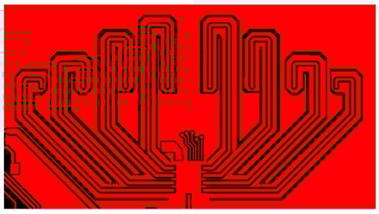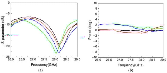 The eight channels of the fully differential BFIC are connected to the respective antenna through the feeding line. All the RF feeding lines are designed with grounded CPW lines to prevent unwanted coupling by adjacent channels. The layout of the feeding lines connecting each channel of BFIC and the respective series fed antenna is shown in Figure 7. The whole feedline length is equal, and the feedline CPW ground is isolated from the overall ground to improve the performance. The EM simulation of all the feedlines is performed to ensure the loss and the same phase of the feedline. The return losses of the feedline are over −10 dB at a frequency of 27.5 GHz to 29 GHz, as shown in Figure 8a. The phase difference in all the feedlines is around 1° at 28 GHz, as shown in Figure 8b. The eight-channel BFIC integrates an SPI. This SPI facilitates both phase and amplitude controls directly on the chip. The SPI controls are wire bonded from the chip to connect the connector in the PCB. Hence, the beamforming module includes SPI interfaces for BFIC control and DC power connectors. A non-soldered K-type connector with a small form factor was used to measure the antenna beam pattern.