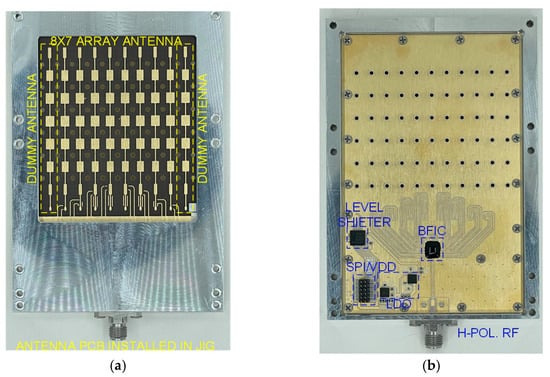 To develop a highly directional beamforming antenna, an array antenna with a series-fed structure was fabricated using a low-loss RF PCB substrate. Figure 9a shows the antenna-side view of the assembled 28 GHz 8 × 7 phased-array antenna beamforming module using an eight-channel CMOS BFIC, and Figure 9b shows the chip-side view of the beamforming antenna module. All the RF lines connecting the antenna and the BFIC were equal in length. An array of dummy antenna surrounded the 8 × 7 array for improved antenna impedance at large scan angles. The spacing between each antenna was 5 mm at 28 GHz. To measure the antenna beam pattern, a non-soldered K-type connector with a small form factor was used. A test pattern of the RF beamforming system was created to integrate the SPI interface and DC power connector for beamforming chip control. The fabricated beamforming antenna measured 100 × 70 × 70 mm3. The beamforming antennas were enclosed in the aluminum structure to minimize heat dissipation and establish a secure ground connection.
