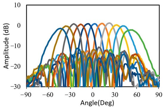 The far field calibration method was used to calibrate each channel of the beamforming antenna. The calibration process involved individually activating each channel to verify the phase and attenuation of the antennas within the array. Following this, adjustments were made to the phase of each antenna element using the tuning phase bits of the beamforming IC. The 28 GHz RF beamforming system was measured in a far-field anechoic antenna chamber with a standard horn antenna, as shown in Figure 10. The phase shifter and attenuator of the eight channels was controlled by the SPI with far-field measurement configuration. The antenna beam was scanned at a step of 10° intervals within a ±50° Field of View (FOV) at the frequency of 28 GHz. The variable attenuator of the beamforming chip was adjusted to apply Chebyshev weighting, resulting in sidelobe suppression of 15 dB. A half-power beam width (HPBW) of 13° was achieved. The normalized measured TX radiation patterns scanning up to ±50° at 28 GHz are shown in Figure 11. Table 1 summarizes the performance of the 28 GHz RF beamforming system and compares it with previously published beamforming modules.