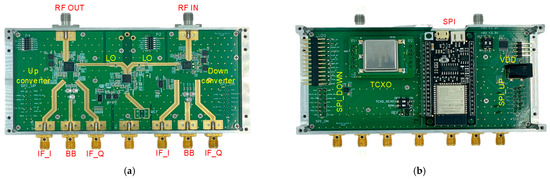 The 28 GHz RF transceiver module consists of an up-converter, down-converter, phased locked loop (PLL) frequency synthesizer, and power and digital controller. In the transceiver module, we used the commercially available chips for the up-converter (ADMV 1013), down-converter (ADMV 1014), and PLL (ADF 4355) from the analog device (Analog Devices, Wilmington, MA, USA). A mixer-based RF transceiver structure was employed to enable simultaneous communication and sensing in the millimeter-wave range by up-converting and down-converting the baseband signal to the millimeter-wave frequency. The 28 GHz RF transceiver used a super-heterodyne method. The RF signal generator was implemented in the form of a frequency synthesizer, based on a PLL, capable of various frequency generations with low spurious content and excellent phase noise characteristics. The upconverter integrated a mixer, RF power amplifier, RF voltage variable attenuator (VVA), and LO frequency quadrupler. An external 90° hybrid coupler was used to achieve single-band up-conversion and to suppress the signal in unwanted sidebands. Similarly, the down-converter integrated the LNA, mixer, IF PA, and LO frequency quadrupler, resulting in the signal being received independently. The up-converter and down-converter provide two modes of frequency translation. The up-converter can directly convert in-phase quadrature (I/Q) input signals from baseband to RF. Additionally, it supports single-sideband (SSB) up-conversion when given complex intermediate frequency (IF) inputs. Similarly, the down-converter is capable of direct quadrature demodulation to the baseband in-phase (I)/quadrature (Q) output signals, as well as image rejection down-conversion to a complex intermediate frequency (IF) output carrier frequency. The assumption of the input signal with image signal and LO source can be expressed as follows: