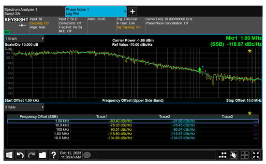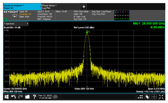 The up-converter measurement of the RF transceiver was performed by supplying the IF frequency of 802 MHz through the signal generator. An external 90° hybrid coupler was used to select the appropriate sideband for conversion and suppress the signal in the unwanted sideband. The measurement setup of the 28 GHz up-converter is shown in Figure 13. The LO of the transmitter applied a 0 dBm signal at a frequency of 6.8 GHz, and a quadrupler was built inside the transmitter, so the LO frequency of the actual frequency converted was applied at 27.2 GHz. At this time, it was confirmed that the RF signal was output at a frequency of 28 GHz, as shown in Figure 14. The image and the LO signals were highly attenuated compared to the RF signal. At this time, the phase noise at a 1 MHz offset frequency was measured to be −118.87 dBc/Hz at 28 GHz, as shown in Figure 15. The frequency conversion gain of the transmitter was measured to be around 20 dB. The down-converter module was designed similarly to the up-converter. The down-converter measurement of the 28 GHz RF transceiver module was performed by supplying the RF frequency of 28 GHz through the signal generator. The measurement setup of the 28 GHz down-converter is shown in Figure 16. An external 90° hybrid coupler was used to select the appropriate sideband. The LO of the receiver applied a 0 dBm signal at a frequency of 6.8 GHz, and a quadrupler was built inside the receiver, so the LO frequency of the actual frequency converted was applied at 27.2 GHz. At this time, the IF signal output at a frequency of 802 MHz was as shown in Figure 17.