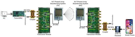 The manufactured 28 GHz RF beamforming system and transceiver module were combined using a K-type connector. The integrated 28 GHz RF beamforming system and RF transceiver module antenna-side view is shown in Figure 18a, and the back-side view is shown in Figure 18b. The integrated module can operate with 8Tx-8Rx mode simultaneously. In particular, the 28 GHz RF beamforming system and transceiver module offer simultaneous data transmission and reception. To verify the communication performance of the manufactured transmission and reception system, a wireless video transmission and reception experiment was performed at a millimeter-wave frequency of 28 GHz. Figure 19 shows the 28 GHz real-time video transmission and reception test setup of the developed video transmission system. The IF transmitter can transmit and receive videos in TS (Transport Streaming) format through a PC, with the capability to transmit signals up to 900 MHz. The receiver can scan a signal up to 900 MHz and display the video. The high-definition video files at 28 GHz are transmitted smoothly in real time without interruption.