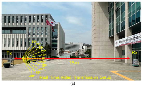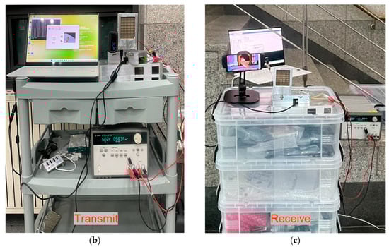 (a) The 28 GHz real-time video transmission outdoor experimental setup: (b) transmitter and (c) receiver.