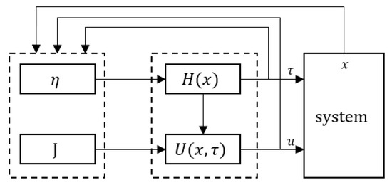 The left side of the inequality (11) reflects the performance metric of the system under the effect of the self-triggered control strategy. Additionally, the future cumulative cost is approximated by employing the Lyapunov function associated with the state, thereby converting the global control performance metric into the form of Expression (10). Thus, the triggering condition suggests that, within the self-triggered control strategy, the control performance must be limited by the Lyapunov function to guarantee the system’s convergence. This setup allows for a degree of sub-optimal control performance, which corresponds to a percentage of the periodic control performance. By adjusting the value of , a balance can be struck between control performance and computational cost. Under the constraints (11), the current state and control variable determine whether maintaining constant over will lead to stable system convergence. The control strategy prescribes the sub-optimal control variable , capable of minimizing the performance index (10), while the triggering strategy aims to maximize the triggering time interval, adhering to the triggering condition. The self-triggered control strategy thus reformulates: