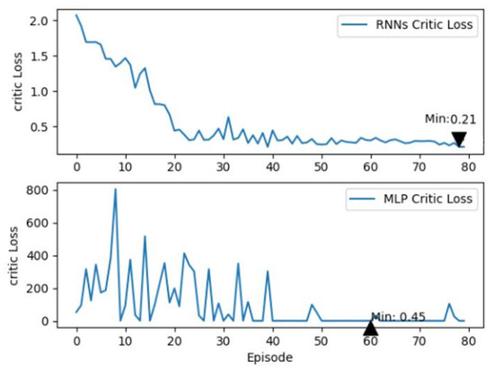 Additionally, a comparative study was conducted to evaluate the fitting performance of RNNs versus MLPs, as depicted in Figure 8. This figure clearly presents the outcomes of our analysis, offering a visual representation of the performance disparities between these two network types. It is noteworthy that, when provided with an equal number of training batches, the MLP displays significant error fluctuations in the initial phase of training, indicating instability. This trend continues until it approaches convergence after approximately 40 episodes, highlighting the challenges in achieving stability with MLP during the early training stages. In contrast, the RNNs display a markedly smoother loss trajectory, achieving convergence after just 20 episodes. This contrast highlights the relative robustness and efficiency of RNNs in this specific learning context. Notably, the minimum loss recorded for RNNs is 0.21, significantly lower than the MLP’s 0.45. This substantial difference underlines the superior fitting accuracy of RNNs in our simulation, suggesting their potential advantage for similar control tasks. This underscores the prowess of RNNs in adeptly capturing the time-dependent relationship inherent in the multi-time cumulative cost function, thereby accelerating the critic network’s learning trajectory and ameliorating fitting accuracy.