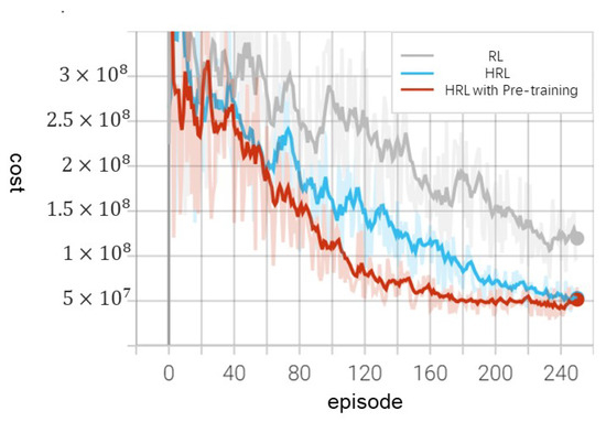 In conclusion, Figure 9 effectively illustrates the substantial impact of the pre-training methodology on the learning efficacy of the algorithm. This is evidenced by the enhanced speed of convergence in terms of episode costs when compared to the model lacking pre-training. This finding underscores the critical role of pre-training in optimizing the performance of HRLSTC algorithms. This notable improvement is primarily due to the pre-training method, which imparts crucial prior knowledge to the control strategy network. It aids in understanding the generic features vital for optimal control and self-triggered mechanisms. As a result, this approach circumvents the inefficiency of continuous trial-and-error processes inherent in sub-optimal strategies, facilitating a faster convergence towards the most effective self-triggered control strategy. On the other hand, Figure 9 also highlights the improvements in learning efficiency of the model-free self-triggered controller based on reinforcement learning, as investigated by previous researchers. We contrast our approach with methods lacking a hierarchical structure. Unlike these methods, our HRLSTC demonstrates enhanced learning efficiency while maintaining a consistent environment, learning rate, and initial state. From the figure, it is evident that the convergence speed of episode costs is faster when employing HRLSTC compared to the RL-based method. This suggests that our approach can more rapidly learn the policy that minimizes the total reward.