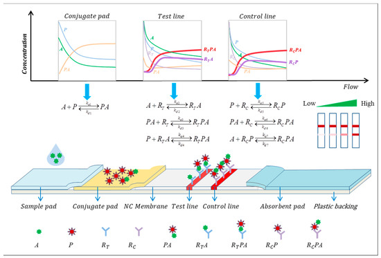 Schematic diagram of the sandwich LFIA model and reaction processes. The model depicts all the reaction processes involved in LFIA.