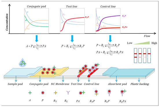 The competitive LFIA reaction process and equations are shown in Figure 2. After the sample liquid is dropped onto the sample pad, due to the capillary action, the analytes () in the sample liquid reacts with the reporter particles () on the conjugate pad to form the analyte–reporter particle complex () when passing through the conjugate pad. When the mixture of (), (), and () migrates to the test line, the antigen analogue () on the test line captures the free reporter particles () to form (). At the control line, the reporter particles () and () are captured by the control line antibodies () to form () and (), respectively. These biochemical reactions are reversible, where represents the association rate constants, and represents the dissociation rate constants.