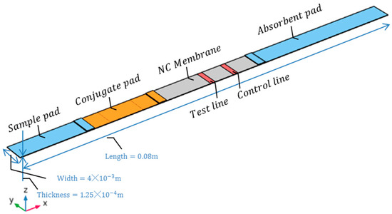 Set material properties and initial conditions for the model, including porous media and fluid. Specifically, materials such as NC membrane and other components (sample pad, conjugate pad, absorbent pad) are set as porous materials with different parameters (porosity, pore size, permeability, etc.), as detailed in Table 1. The initial conditions of the model include the initial concentration distribution of various substances, the initial state of the porous media, and the initial conditions of the domain, as described in Section 3.2. Select the solver and iterative algorithm to start iterative calculations. In each iteration, COMSOL updates boundary conditions based on the current solution and adjusts them according to residuals or other convergence criteria. Using the updated boundary conditions, the solver is called again, gradually approaching the final solution. This iteration scheme is repeated until the fluid velocity becomes zero, but the reaction–diffusion process continues to evolve. The solver continues to iterate until the final time step is reached.