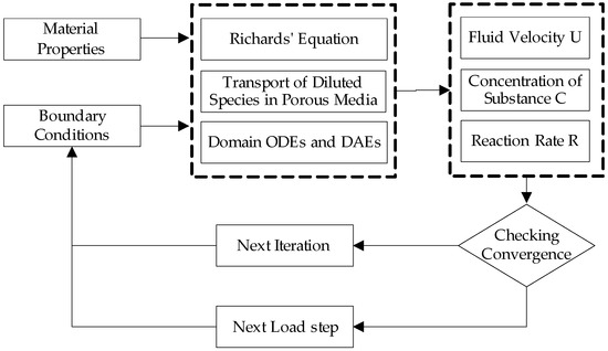 In COMSOL, LFIA three-dimensional models were established using the Richards equation, transport of dilute species in porous media, and domain ordinary differential equation physics interfaces, and the geometric diagram of the model is shown in Figure 3. The simulation process involves iterative calculations of fluid velocity, substance concentration distribution, and reaction rate coupling fields. During the solving process, COMSOL utilizes iterative algorithms to gradually approximate the solution of the model, as illustrated in Figure 4.