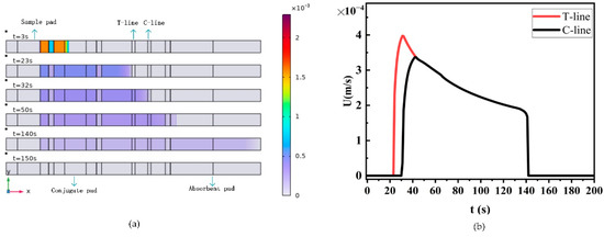 Flow velocity is one of the most important factors affecting the sensitivity of LFIA. In LFIA, once the analytes and reporter particles in the sample solution pass through the T-line and C-line, they cannot be captured. A slower flow velocity allows more interactions between reporter particles and capture reagents, leading to higher signal intensity [36]. Flow velocity is difficult to measure accurately in experiments, but it can be easily calculated in finite element simulation software.