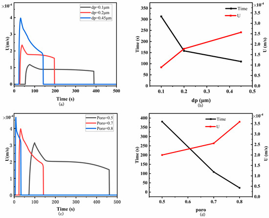 Effect of different pore sizes and porosities on flow velocity. (a) Flow velocity of liquid passing through the T-line for different pore sizes; (b) time and average velocity of liquid passing through the T-line for different pore sizes; (c) flow velocity of liquid passing through the T-line for different porosities; (d) time and average velocity of liquid passing through the T-line for different porosities.