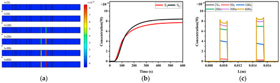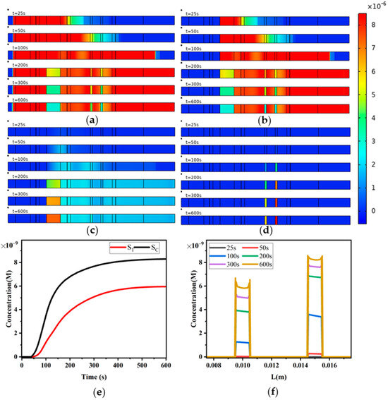 Figure 15b depicts the variation in T-line and C-line signals ST and SC over time. According to the reaction kinetics equation, the T-line only captures free reporter particles P, while the C-line captures not only free reporter particles P but also the reporter particle–analyte complex PA. Therefore, after the reaction reaches equilibrium, SC is higher than ST.