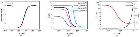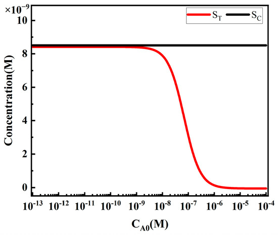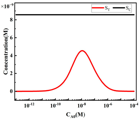 The influence of target analyte concentration on ST follows a sigmoidal curve (Figure 16), which is a typical form of calibration curves in competitive analysis [30]. When the target analyte concentration is low, the analytes A have little effect on the concentration of free reporter particles P, resulting in a high and relatively constant ST value. As the analyte concentration increases, the competitive reaction between analytes A and reporter particles P intensifies, leading to a decrease in the concentration of free reporter particles P and a nearly linear decrease in ST. When the analyte concentration reaches a certain level, the competitive reaction between analytes A and reporter particles P saturates, and ST no longer changes with increasing analyte concentration. SC, on the other hand, remains unaffected by changes in analyte concentration, which is why the T/C ratio is commonly used as the detection result in commercial assays.