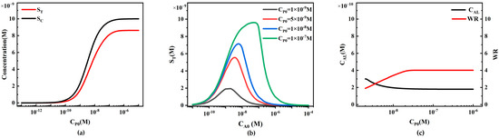 In sandwich LFIA, we take 1.5 × 10−9 M as the threshold value STL for ST. The target analyte concentration (CAL) corresponding to the threshold value STL is defined as the detection limit (CAL). The range of target analyte concentrations (CAM) corresponding to the maximum signal (STmax) from the detection limit (CAL) to ST is defined as the working range (WR) [32]: