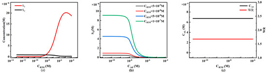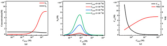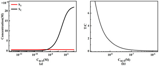 Because ST is insensitive to changes in CRC0, similarly, the system detection limit and working range are also insensitive to changes in CRC0. However, in commercial quantitative detection, to reduce inter-batch variability, the T/C value is usually used as the final detection signal. When SC increases linearly with CRC0, the T/C value (ST/SC) decreases (Figure 12b). In practical detection, this change may lead to a decrease in detection sensitivity due to the influence of detection noise. Therefore, in experiments, CRC0 should be limited to avoid adversely affecting the system detection performance by keeping the T/C value from being too low.