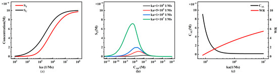 The relationship between association rate constant ka and LFIA detection performance: (a) Variations in ST and SC under different association rate constants ka; (b) inverse S-shaped standard curves under different association rate constants ka; (c) trends of LFIA detection limits and working ranges under different association rate constants ka.