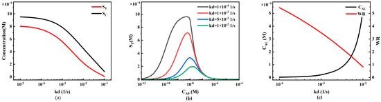 The impact of the dissociation rate constant kd on system performance is exactly the opposite of the association rate constant ka (Figure 14). An increase in kd leads to a decrease in the reaction rate, significantly reducing the capture capacity of the T-line and C-line, resulting in a decrease in ST and SC (Figure 14a). In the HOOK effect curves at different analyte concentrations (Figure 14b), an increase in kd leads to a rightward shift in the curve peak, indicating an increase in the detection limit, which reduces the sensitivity of the system, while the working range also narrows (Figure 14c).