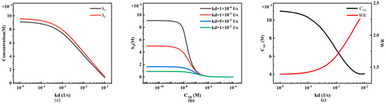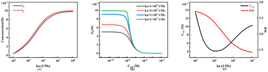 The reaction rate constants, including the association rate constant ka and the dissociation rate constant kd, play a crucial role in LFIA performance. Significant effort is required in experimental research to select antibodies with different ka and kd values because different ka and kd values correspond to different reagent reactions in various LFIA detection processes. Therefore, we can utilize simulation methods to analyze the impact of ka and kd values on antigen–antibody binding reactions (Figure 13 and Figure 14).