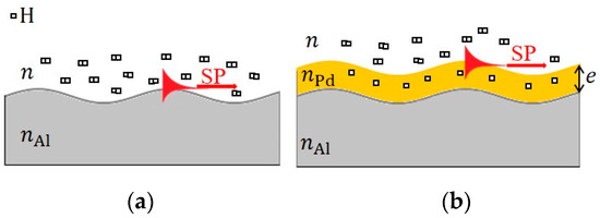 Here, we note that SPR occurs in the bare Al portion and in the Pd-deposited portion of the aluminum grating. Figure 2 illustrates the cross-sections of the bare Al portion and the Pd-deposited portion which were exposed to hydrogen gas in air. Surface plasmons in the bare Al portion are excited along the surface of the aluminum grating, and the resultant SPR depends on the refractive index of the upper region of the bare Al portion, , and the complex refractive index of Al, . When the bare Al portion is exposed to hydrogen gas, a significant change in the behavior of the SPR does not appear because the refractive index of hydrogen gas is close to that of air and the complex refractive index of Al is largely unaffected due to hydrogen gas exposure. On the other hand, SPR in the Pd-deposited portion is caused by the excitation of surface plasmons, supported by the Pd thin-film layer, if its thickness is thick (for instance, 50 nm). When exposed to hydrogen gas, the Pd thin-film layer selectively absorbs hydrogen as a hydrogen sensitivity material, resulting in a change in the complex refractive index of the Pd thin-film layer [11,17]. Therefore, SPR in the Pd-deposited portion is significantly affected by hydrogen gas exposure.