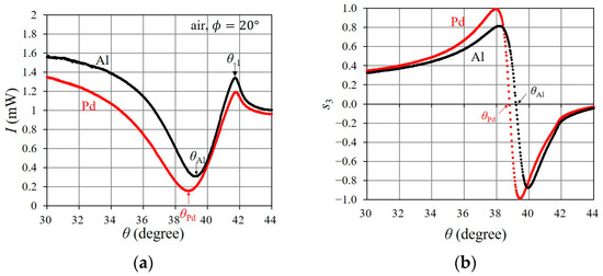 SPR in the bare Al portion and in the Pd-deposited portion on the aluminum grating when when the gas sample is air. (a) Intensity of reflected light, and (b) normalized Stokes parameter, . “Al” and “Pd” indicate the portion that is illuminated by the incidental light (i.e., bare Al portion and Pd-deposited portion).