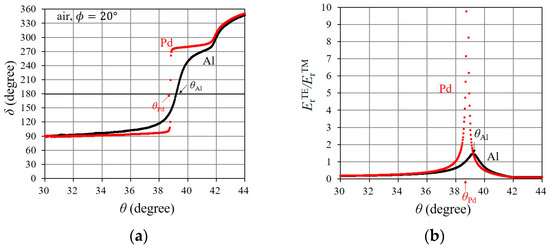 Here, we describe the occurrence process of the rapid change in through the behavior of the TE- and TM-components of the reflected light when SPR occurs in the Pd-deposited portion. This will facilitate a clear understanding of the effectiveness of the SPR sensing technique using the rapid change in with the steep slope. Figure 6 shows the and curves which correspond to SPR in Figure 5b. With SPR, regarding the bare Al portion, varies from to via at at the same time, increases in the vicinity of . Both the phase shift of [34] and the increase in [25] result in a rapid change in at around [23]. With SPR in the Pd-deposited portion, very rapidly fluctuates from to at . In addition, sharply increases in the vicinity of due to the elimination of , which is caused by the almost total absorption of the TM component of the incidental light by SPR. Thus, the steep slope of the rapid change in in the Pd-deposited portion, is caused by the rapid phase shift of and a sharp increase in ; these are largely affected by a change in the occurrence conditions of SPR in the Pd-deposited portion layer.