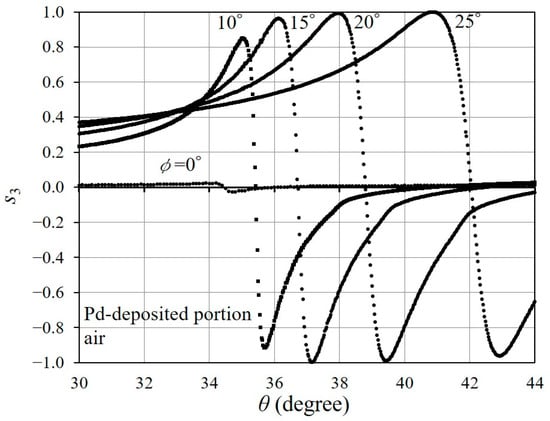 The azimuthal angle in a conical mounting has an effect on the behavior of the rapid change in . Figure 7 shows the curves of the reflected light from the Pd-deposited portion for and , in addition to that for , as shown in Figure 5b. We set the azimuthal angle as at which point, the curve becomes zero, except for a slight variation in the vicinity of the resonance angle. Then, we chose the that gave the steeper slope for the rapid change in and which, at the same time, caused to vary over a wider range. The slope of the curve in the vicinity of the resonance angle is related to the sharpness of SPR [23], which affects the sensitivity of the refractive index measurement. In Figure 7, the rapid change in for produces a steep slope around the resonance angle, and the fluctuates across a whole range from to . Therefore, we used as the azimuthal angle in the following experiments.