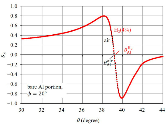 SPR in a metal grating, in a conical mounting, has been studied [27,28,29,30,31,32], and it has interesting features for refractive index sensing [25,28,31,32]. In particular, the polarization property of the reflected light associated with SPR is attractive [23]. When the TM-polarized light is incidental on either the Pd-deposited portion or the bare Al portion on the aluminum grating in the conical mounting, TM and TE components appear in the diffracted light. Here, TM and TE mean that the relevant magnetic and electric fields are transverse to the axis, respectively. The reflected light from the Pd-deposited portion or the bare Al portion includes the TM- and TE-components; then, it becomes elliptically polarized in general for the TM-polarized incidence. To examine the polarization state of the reflected light, we measured its Stokes parameters to with a polarimeter (Thorlabs Inc., Tokyo, Japan, PAX1000VIS). As a quantity for detecting hydrogen gas, we employed the Stokes parameter that was normalized by the intensity of the reflected light :