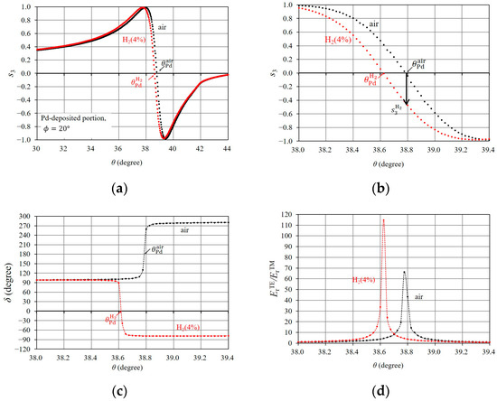 We examine the polarization property of the reflected light associated with SPR when the Pd-deposited portion, or the bare Al portion, is exposed to . Figure 8 shows the curves for air and in the bare Al portion. The curve for is almost identical to that for air, with a very slight difference around their resonance angles. Therefore, it was difficult to detect hydrogen gas with a concentration near the LEL (for instance, ) using the rapid change in in the bare Al portion. Next, we describe the effect of the exposure of the Pd thin-film layer to on the polarization property associated with SPR. Figure 9a shows the shift in the curve near the resonance angle due to exposure, and Figure 9b clearly illustrates the difference between the rapid change in for and air. The difference between the rapid change in , which was caused by the change in the complex refractive index of the Pd thin-film layer upon exposure to , is explained with the resonance properties of and which are associated with SPR. As shown in Figure 9c,d, for fluctuates from to via , whereas for air fluctuates from to via , and the peak value of for is larger than that for air. Thus, the exposure of the Pd thin-film layer to has a significant effect on the phase shift of and the increase in , resulting in the significant shift in the rapid change in .
