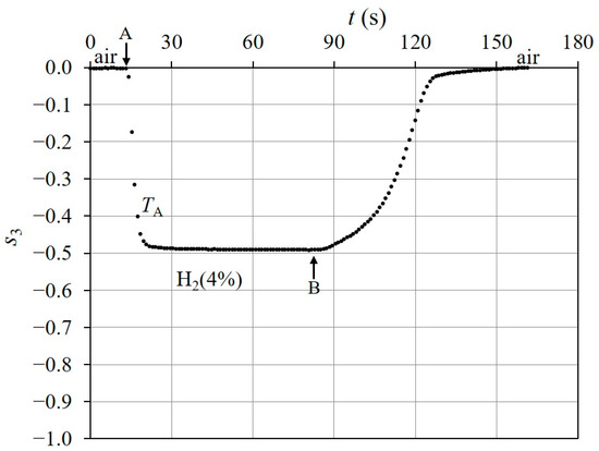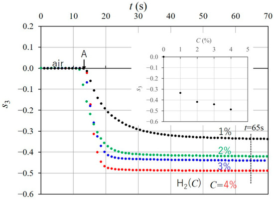 We examined the response of to four hydrogen gases, with different concentrations in nitrogen, . Figure 13 shows the time responses of when each was injected into the chamber at point A in the initial state, and the inset plots the value of at s, as a time response, as a function of . The response value fluctuates significantly, reaching up to nearly 2%, but it fluctuates slowly above that level. This behavior, caused by the response to hydrogen gas concentration, which has been reported in the literature [9,11,14,35,36], is explained by the crystallographic phases of the palladium–hydrogen system in references [11,35]. Moreover, the time taken for to stabilize increases as decreases [11].