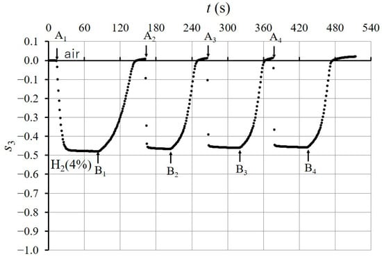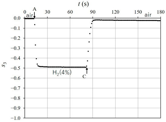 Figure 10 shows the time response of when the injection of into the chamber started at s (point A on the figure) in the initial state and stopped at t = 83 s (point B). In Figure 10, the response value reaches , which is close to (see Figure 9b), and the response time is s. We used the response time, which was defined as the time necessary for the response to vary from the initial state to 90% of the total change [14]. After the shutdown of B, the remaining in the chamber dissipated into the atmosphere, and returned to its initial state (air) in s. If the in the chamber is removed more quickly, returns to the initial state more quickly. Figure 11 shows that returned to its initial state in s from the shutdown (point C on the figure), when was exhausted with a pump. Figure 12 shows the time response of when the injection and dissipation of was repeated four times in succession. was injected into the chamber at A1 to A4 (shown in the figure) and in the chamber dissipated into the atmosphere after the shutdown of B1 to B4. The time response of indicates good repeatability for the successive exposure of the Pd-deposited portion to .