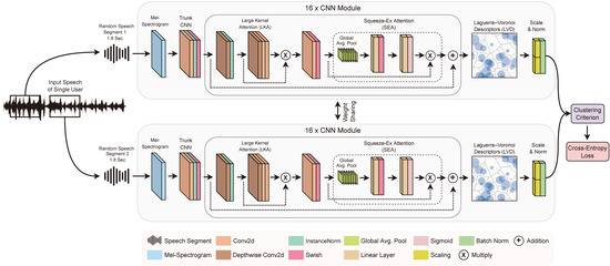 The proposed framework is self-supervised and capable of open-set recognition. As a result, it can be trained using an unlabeled speech dataset and then applied to recognize speakers across various datasets. Similar to the prior works [8,9,24], it is assumed that the model is trained with a dataset, where each piece of audio contains the speech of only one person. For each audio piece, two random segments from the audio speech is selected to train the LVDNet model in every epoch. The LVDNet model is fed with the pair of audio pieces while training, where the task is to produce similar (not effectively exact) speech embedding for the same speakers. Figure 1 explains the training strategy along with the proposed network architecture. The following subsections sequentially introduce the LVDNet architecture, the Laguerre–Voronoi descriptor, and the cluster criterion.