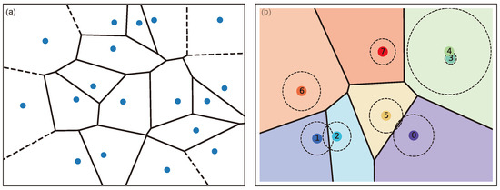 Here, is the power distance function in Laguerre geometry, defined in Equation (4). Figure 3 illustrates the Voronoi diagram and the Laguerre–Voronoi diagram.