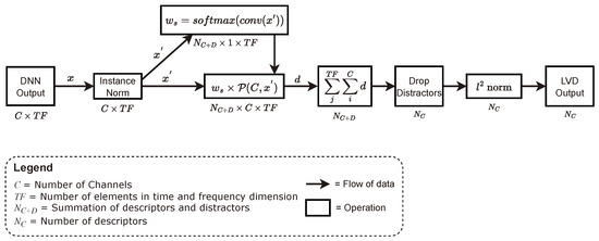 Figure 4 depicts the workflow of the LVD. The output of LVDNet, a three-dimensional feature map , undergoes the merging of the temporal and frequency dimensions, . Instance normalization is applied to the merged feature, . Further weight is calculated from the normalized input by performing convolution followed by a softmax function. The weight is used to scale the power distance between the feature maps and each of the centroids. Centroids dynamically converge to the locations where various important speech properties are congregated in the embedding vector space. The power distance function calculates the distance of the features from the learnable centroids. The power distance from the feature maps to the centroids indicates how well a feature holds a certain property of speech. There are a total of centroids, where C is the number of speech descriptors and D is the number of distractor descriptors. While the speech descriptors try to find the quality or intensity of certain speech characteristics from the feature map, distractors identify the impure features in the feature vector space. The dimension of the power distance is reduced by summing over the channel axis and the temporal frequency axis. As a result, the output indicates the intensity of each speech descriptor and distractor. As the distractor centroids only find the intensity of common irrelevant features, they are dropped from the final features. Finally, the centroid descriptor is normalized.